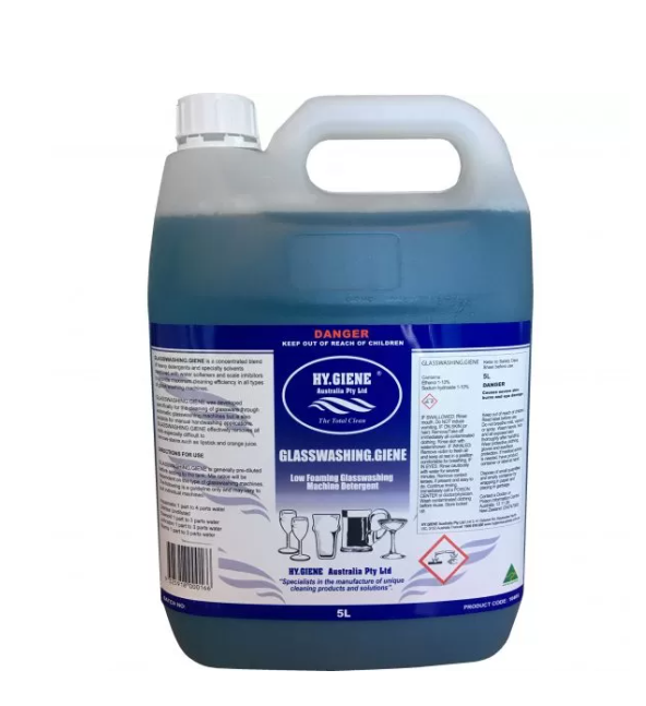 GLASSWASH.GIENE is a concentrated blend of heavy detergents and specialty solvents combined with water softeners and scale inhibitors to provide maximum cleaning efficiency in all types of glass washing machines.