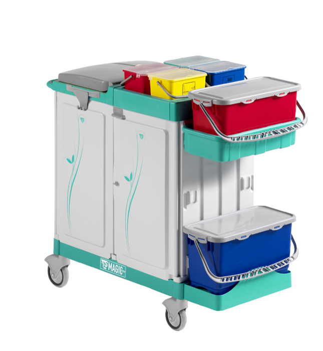 Medium Base Trolley red, blue, yellow, and green 4L buckets with lids