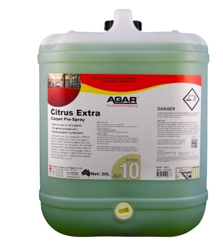 A fast-acting, biodegradable, pre-spray detergent, CITRUS EXTRA is designed for use on all types of carpet. CITRUS EXTRA is diluted and then sprayed directly onto the carpet. It is then extracted with clean water.