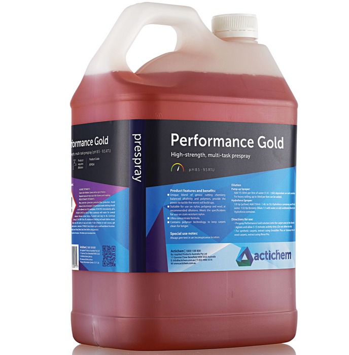 Performance Gold is a unique blend of high performance surfactant chemistry, soil release agents and solvents which combine to provide grease cutting power normally only associated with high pH, heavy duty degreasers. The beauty is that whilst Performance Gold rips through the toughest of grime it cares for the carpet fibre at the same time and rinses freely to leave the carpet chemical free.