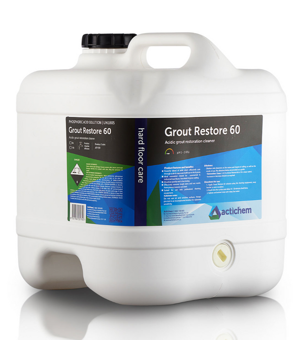 Grout Restore 60 is a detergent boosted solution containing 60% active phosphoric acid for the effective & economical removal of cement & grout residues, mineral scale build-ups and efflorescence. Its powerful blend of acids and penetrating agents provide tough action on general grime and is excellent for grout restoration.