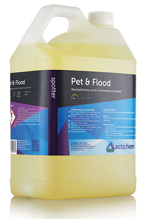 Pet & Flood is a unique spotting solution for high performance removal of cellulosic browning, urine stains and the associated odours. This innovative formulation combines a powerful urine crystal & stain removal blend with a 2-pronged microbiocidal chemistry specific to Urine decontamination and odour neutralization.