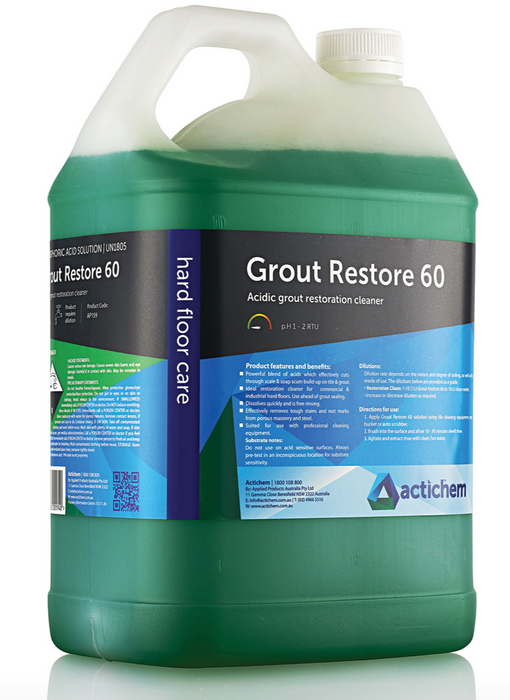 Grout Restore 60 is a detergent boosted solution containing 60% active phosphoric acid for the effective & economical removal of cement & grout residues, mineral scale build-ups and efflorescence. Its powerful blend of acids and penetrating agents provide tough action on general grime and is excellent for grout restoration.