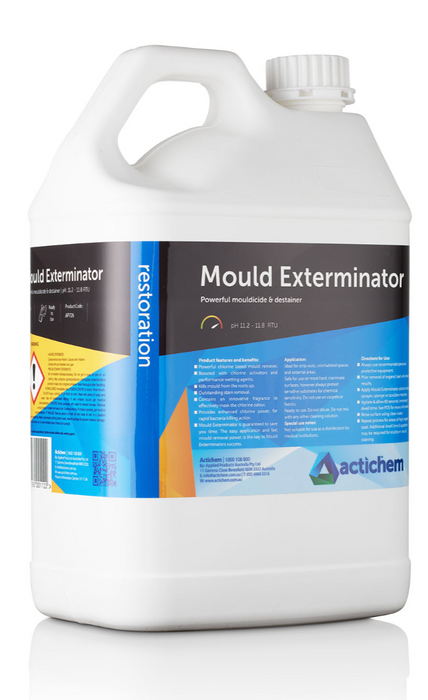 Actichem’s Mould Exterminator (AP726) is the fruit of years of research into the potentiation of the chlorine activity in hypochlorite solution. This new Innovative chemistry significantly enhances the existent oxidising activity found in chlorine and in turn produces amazingly rapid collapse of the base fungal/mould cell. This incredible mould killing action has been further enhanced with super wetting agents which guarantee ultimate penetration through organic load and deep into porous substrates.
