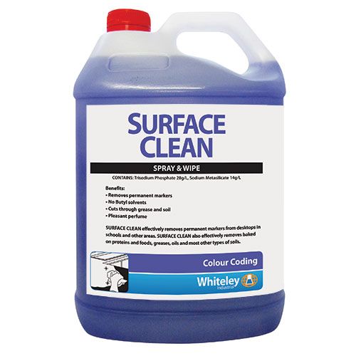 Surface Clean is safe to use on most surfaces including, bench and counter tops, sinks and basins, stove tops, glass, porcelain, formica and stainless steel. Surface Clean is effective at removing permanent markers from desk tops in schools and other areas. Surface Clean also performs superbly as a concrete cleaner. The high foaming detergent system penetrates the porous concrete surface to lift and suspend in-ground, difficult to remove soils. Please note: Surface Clean is not suitable for use on painted surfaces.