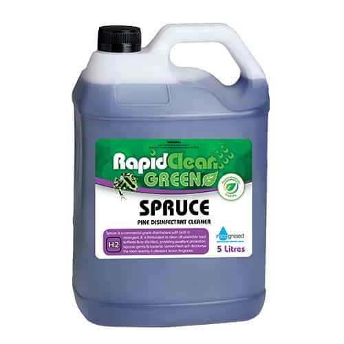 RapidClean Spruce Disinfectant is a clear purple coloured liquid that contains a combination of cleaning agents and highly effective quaternary sanitisers plus a long lasting pine residual perfume.