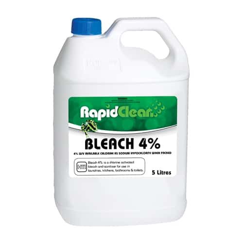 RapidClean Bleach 4% INDUSTRIAL STRENGTH BLEACH and DISINFECTANT is a chlorine activated bleach and sanitiser for use in laundries, kitchens, restaurants, bathrooms and toilets.