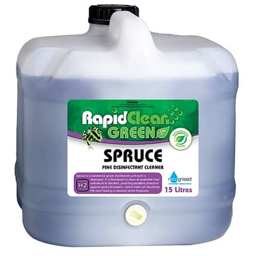 RapidClean Spruce Disinfectant is a clear purple coloured liquid that contains a combination of cleaning agents and highly effective quaternary sanitisers plus a long lasting pine residual perfume.