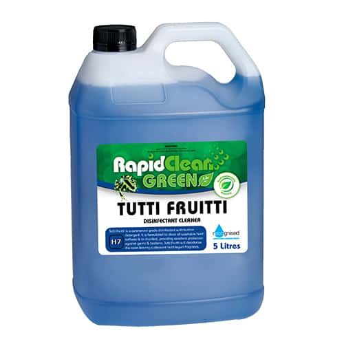 RapidClean Tutti Fruitti Disinfectant is a blue coloured liquid that contains a combination of cleaning agents and highly effective quaternary sanitisers plus a long lasting bubble gum residual perfume.