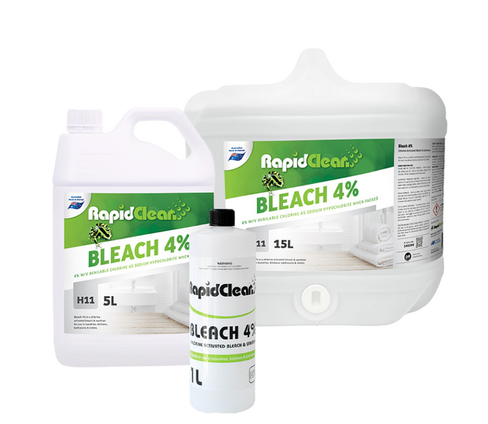 RapidClean Bleach 4% INDUSTRIAL STRENGTH BLEACH and DISINFECTANT is a chlorine activated bleach and sanitiser for use in laundries, kitchens, restaurants, bathrooms and toilets.